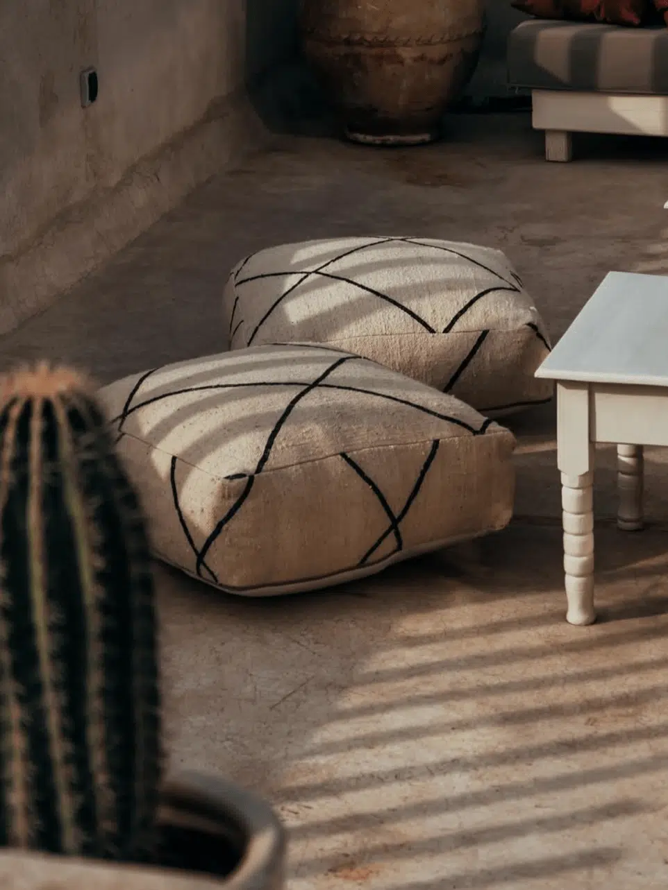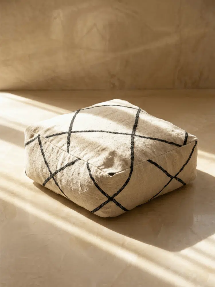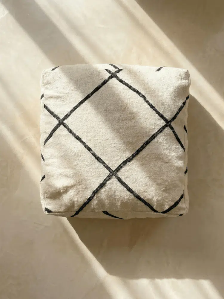 פוף מרוקאי זה הוא השילוב המושלם בין עיצוב נקי לטקסטורת בוהו חמימה. הפוף עשוי מתערובת צמר ובעל טקסטורה עשירה בגוון שמנת טבעי, ומעוטר בדוגמה גיאומטרית קלאסית של מעוינים בקווים שחורים, בהשראת אריגת הברבר המסורתית. הצורה המרובעת והמובנית שלו מעניקה תמיכה מצוינת, מה שהופך אותו לאידיאלי לישיבה נמוכה נוספת כשיש אורחים, כהדום נוח לרגליים, או פשוט כפריט עיצובי שמוסיף אופי לסלון, לפינת הזולה או למרפסת המקורה.