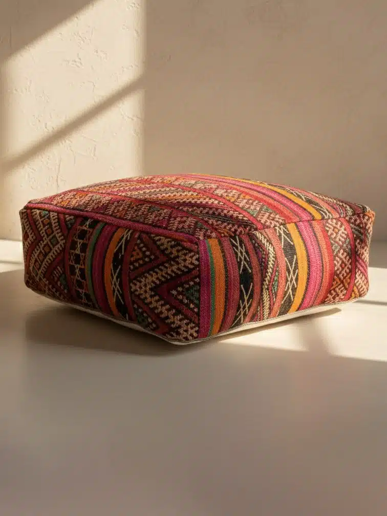 הוסיפי לחלל שלך טאץ' של יוקרה בוהמיינית ואותנטיות עם פוף הוינטג' המיוחד הזה. כל פוף נתפר בעבודת יד משטיח קילים מרוקאי עתיק, מה שהופך אותו לפריט חד-פעמי שאין שני לו. הטקסטורה העשירה של הצמר והצבעים החמים והטבעיים משתלבים בהרמוניה בכל סגנון עיצוב, ומעניקים לחדר אווירה חמימה ומזמינה. זהו פריט שהוא גם פרקטי לישיבה וגם יצירת אמנות בפני עצמה.