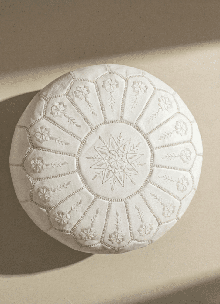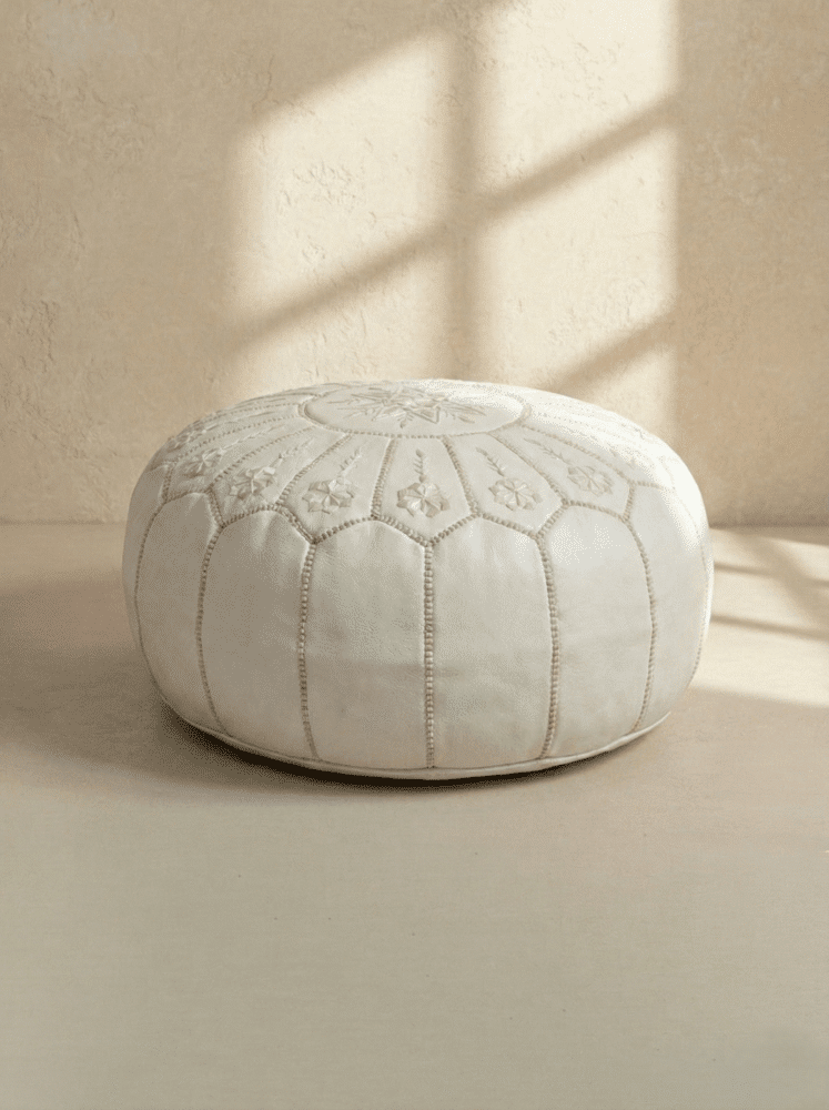הדום עור אותנטי בעבודת יד ממרוקו, עם רקמה לבנה עשירה. מושלם כהדום לרגליים, מושב נוסף או פריט דקורטיבי ייחודי, חגיגה של אומנות ומורשת מרוקאית.