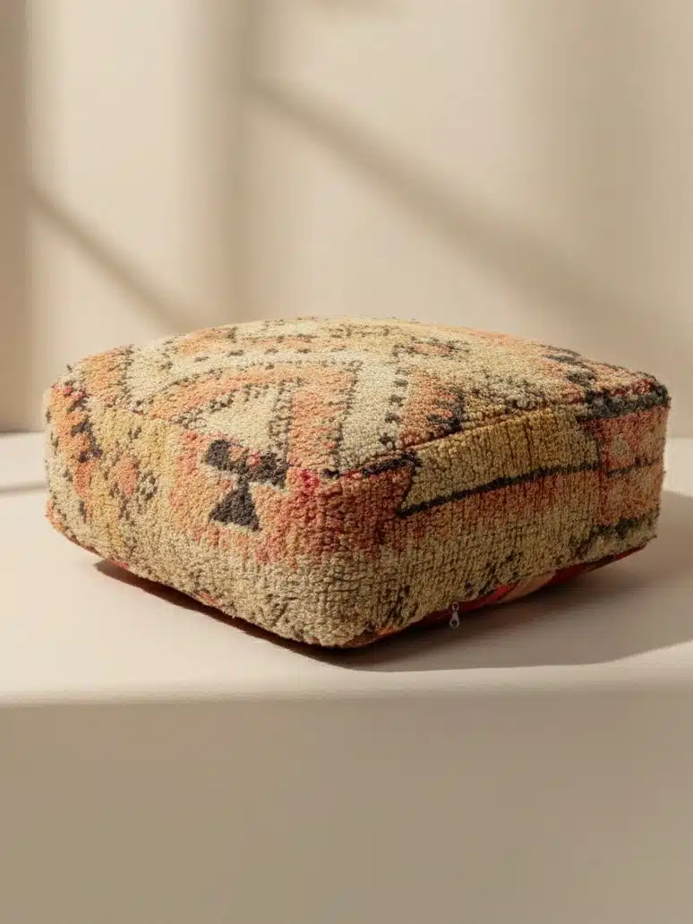 הוסיפי לחלל שלך טאץ' של יוקרה בוהמיינית ואותנטיות עם פוף הוינטג' המיוחד הזה. כל פוף נתפר בעבודת יד משטיח צמר מרוקאי עתיק, מה שהופך אותו לפריט חד-פעמי שאין שני לו. הטקסטורה העשירה של הצמר והצבעים החמים והטבעיים משתלבים בהרמוניה בכל סגנון עיצוב, ומעניקים לחדר אווירה חמימה ומזמינה. זהו פריט שהוא גם פרקטי לישיבה וגם יצירת אמנות בפני עצמה.