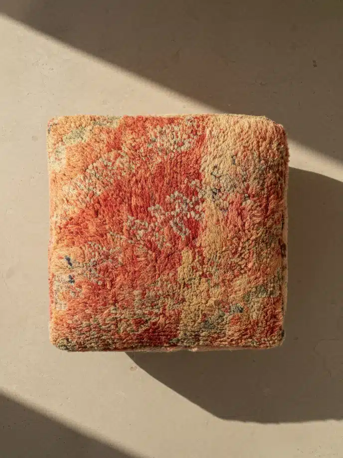 פוף וינטג' מרוקאי ייחודי, שנתפר בעבודת יד משטיח עתיק ועשיר בהיסטוריה. הגוונים החמים של טרקוטה, ירקרק ובייג', בשילוב עם דוגמאות מסורתיות, מכניסים חום, אופי ואותנטיות לכל חלל. כפריט וינטג' מקורי, כל פוף הוא יחיד במינו ואין שני לו, עם סימני זמן קלים שרק מוסיפים ליופיו. מושלם ככרית רצפה נוחה או כפריט עיצובי בולט בסגנון בוהו-שיק.
